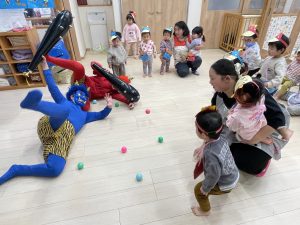 鬼の帽子とバックを作り節分祭の準備OK ビニールで作ったコロコロ鬼にカラーボールを当てて鬼退治ごっこをしました。 赤鬼さん・青鬼さんの登場にみんな ドキド...
